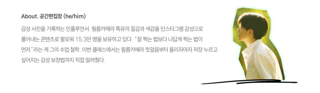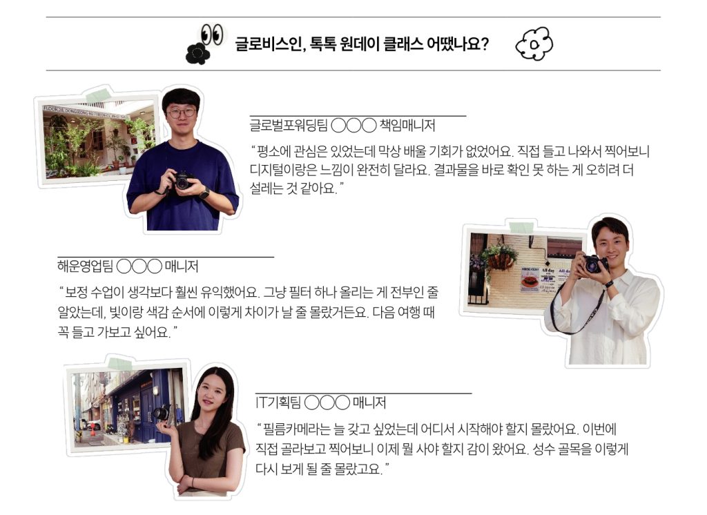 이날의 주인공은 글로벌포워딩팀 ○○○ 책임매니저, 해운영업팀 ○○○ 매니저. 클래스 공간 곳곳에 선생님이 직접 찍은 필름 사진들이 가득했고, 셋은 들어서자마자 이미 설레고 있었다.