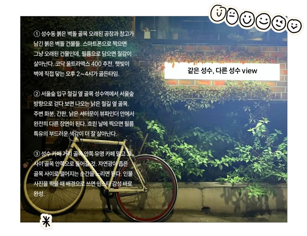 필름 특유의 질감, 색감, 그리고 그 불완전함까지. 요즘 가장 힙한 취미가 성수동 골목